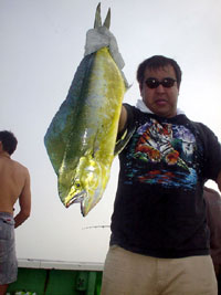 - 左:梨本様 感動の初シイラ。CGP-7012i ソルティガブラスト4000 ナイロン16lb