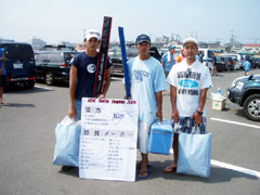 1位に輝いた米村さん(6号船)。シイラ135cmをジップベイツの Zabla System Minnow 15HD Sinking(ピンク)で釣りました。なんでも、左に写っているKさんのジャークベイトを食う寸前にシイラが「やっぱこっち!」と言って乗り換えたのだとか。