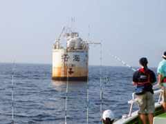 平塚沖25kmに浮かぶ拓海(たくみ)。ディーゼルポンプで200mの深海からミネラル分の多い海水を汲み上げ、海面直下に放出しています。この周りだけ海水温に若干変化がある程度でしょうが、このようなブイをたくさん作れば、イワシがプランクトンを求めて相模湾に入ってくるのではないかと考えられている・・・ラシイです。(現在実験中)