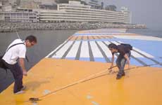 堤防に到着、逸る気持ちをおさえることが出来ないマッツン、早速スタート。さあ、船が迎えに来るまでの9時間半がど〜ゆ〜ことになるのか?