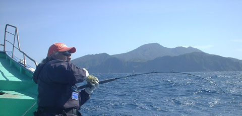 が、反応なし。さらに八丈小島の島陰へ移動。ここでは餌釣り師の竿が曲っていた。「はい、どうぞ」の合図で数投目、同船した竹林さんに待望のヒット。上がってきたのは1kgクラスのカンパチ。い〜ね〜。