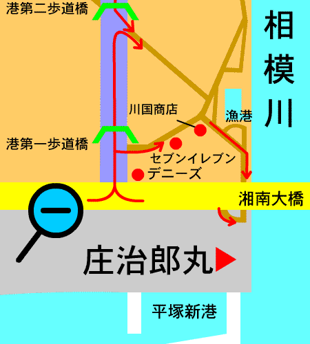 *湘南大橋をくぐったら、庄治郎丸の方(右)へ行かずに、まっすぐ進んで有料駐車場に車を停めてください。特設会場は平塚新港内にあります。