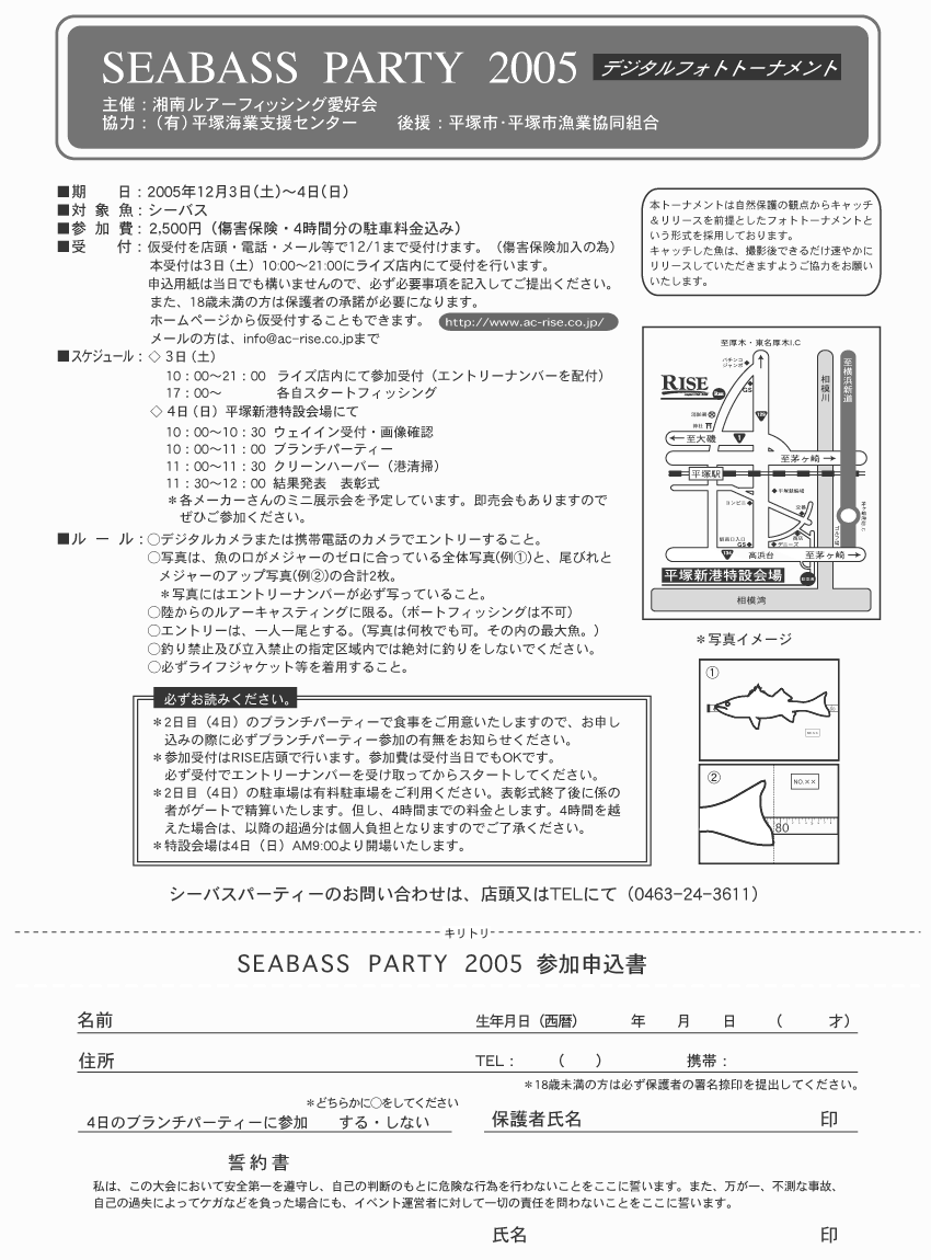 魚の口がメジャーのゼロに合っている全体写真(1)と、尾びれとメジャーのアップ写真(2)。合計2枚で、当日お渡しするエントリーナンバーと、メジャーを添えてデジタルカメラでシーバスの写真を撮っていただきます。(今回、メジャーはご持参下さい。)それから、できれば魚を持った写真も撮ってください。(必須ではありません)